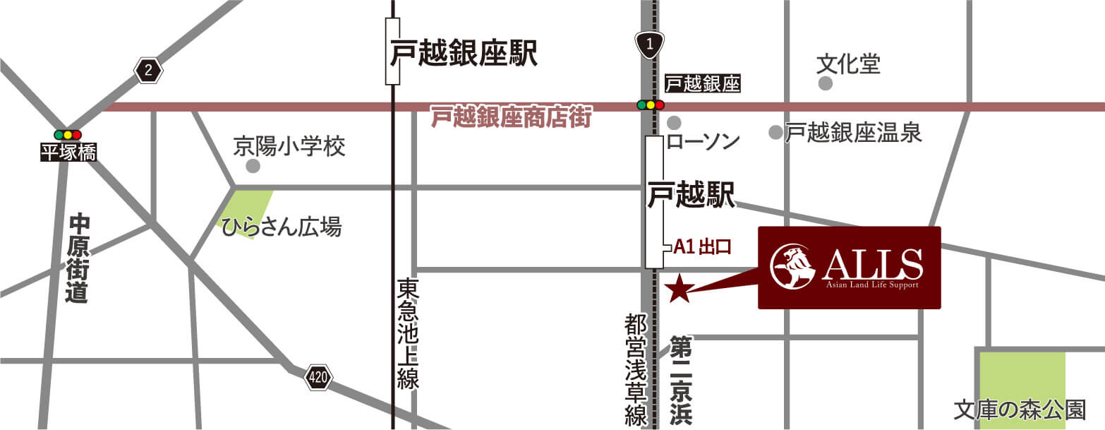 私どもは2005年、品川区の⼾越銀座商店街にて、不動産開発に関する総合コンサルタント会社として発⾜いたしました。